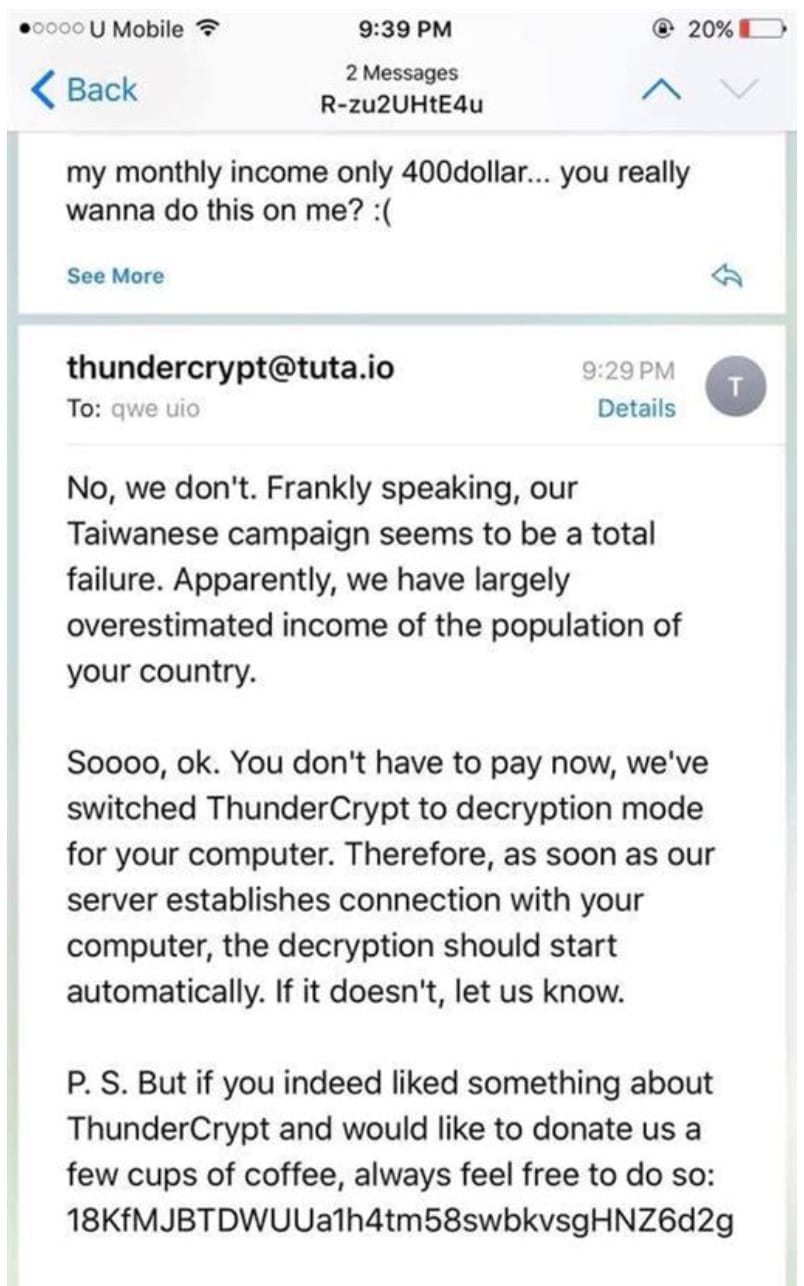 The ransomware component — named ThunderCrypt — was first detected by Kaspersky in April 2017, though Kaspersky had no idea at the time that it was part of a larger operation. A month after Kaspersky detected it, the ransomware appeared in a news story in Taiwan when a Taiwanese citizen got infected with it and pleaded with his attackers to release his files without paying the 0.345 bitcoin ransom. He told them he only earned the equivalent of $400 a month and therefore couldn’t afford the ransom, and the attackers — uncharacteristically for ransomware actors — took pity on him and said they had overestimated the income of people in Taiwan.