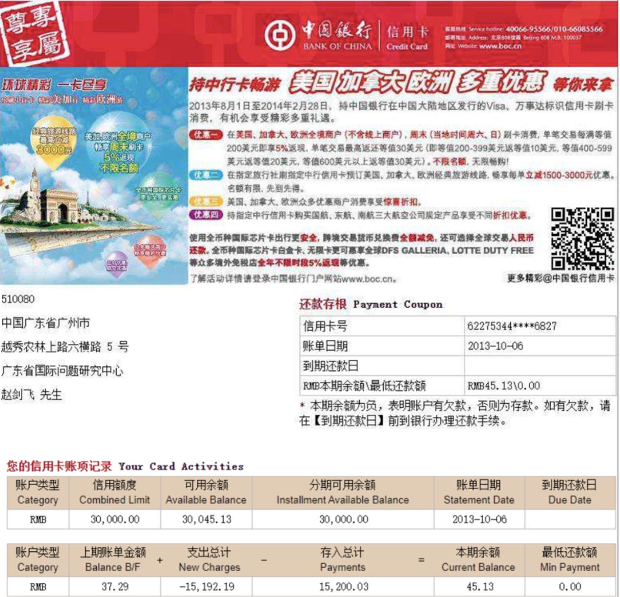 The address for the research facility was on Upper Nonglin Road in Guangdong, so Intrusion Truth asked its network of contributors for anything related to the address. A “trusted source with connections to the Bank of China” produced credit card statements that were purportedly sent by the bank to a person named Zhao Jianfei at the research facility’s address. A second bank statement was emailed to asls1027@hotmail.com.